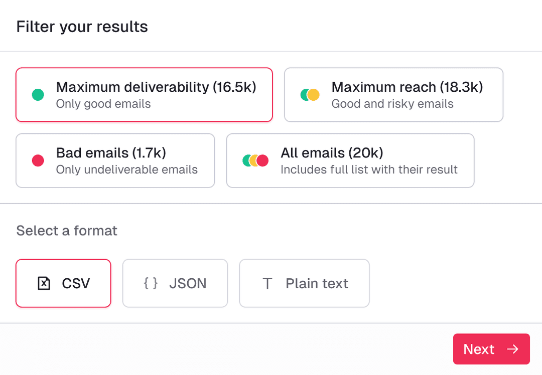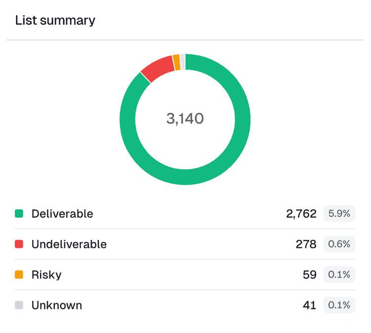 We give you insights and statistics about your email list, so you can make better decisions. You will also be able to inspect the results, see the reason some addresses are invalid, and download the good ones.